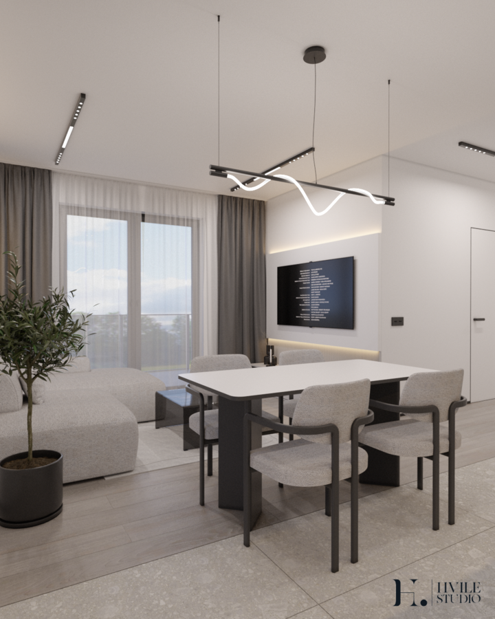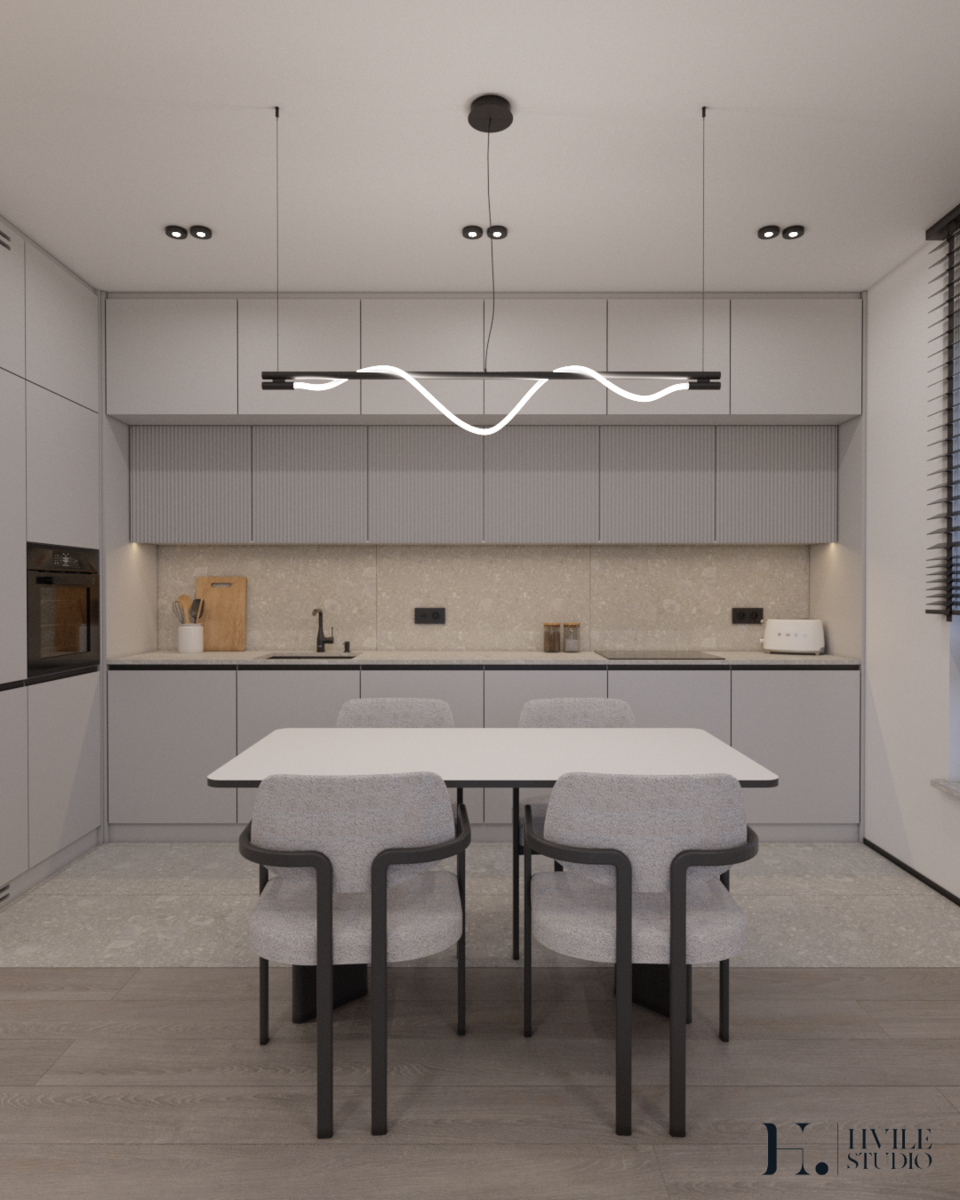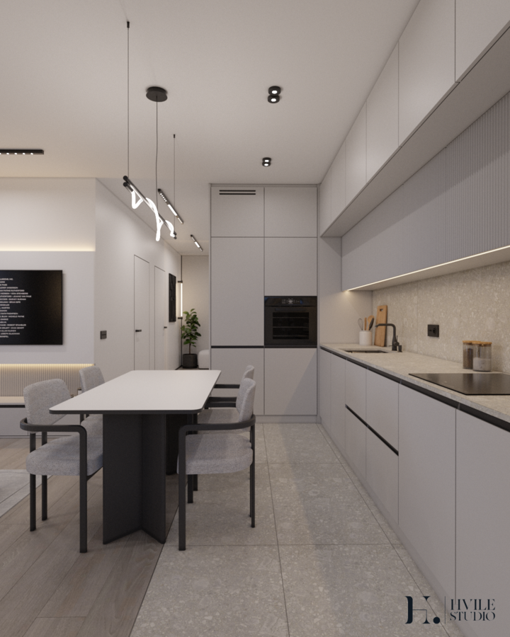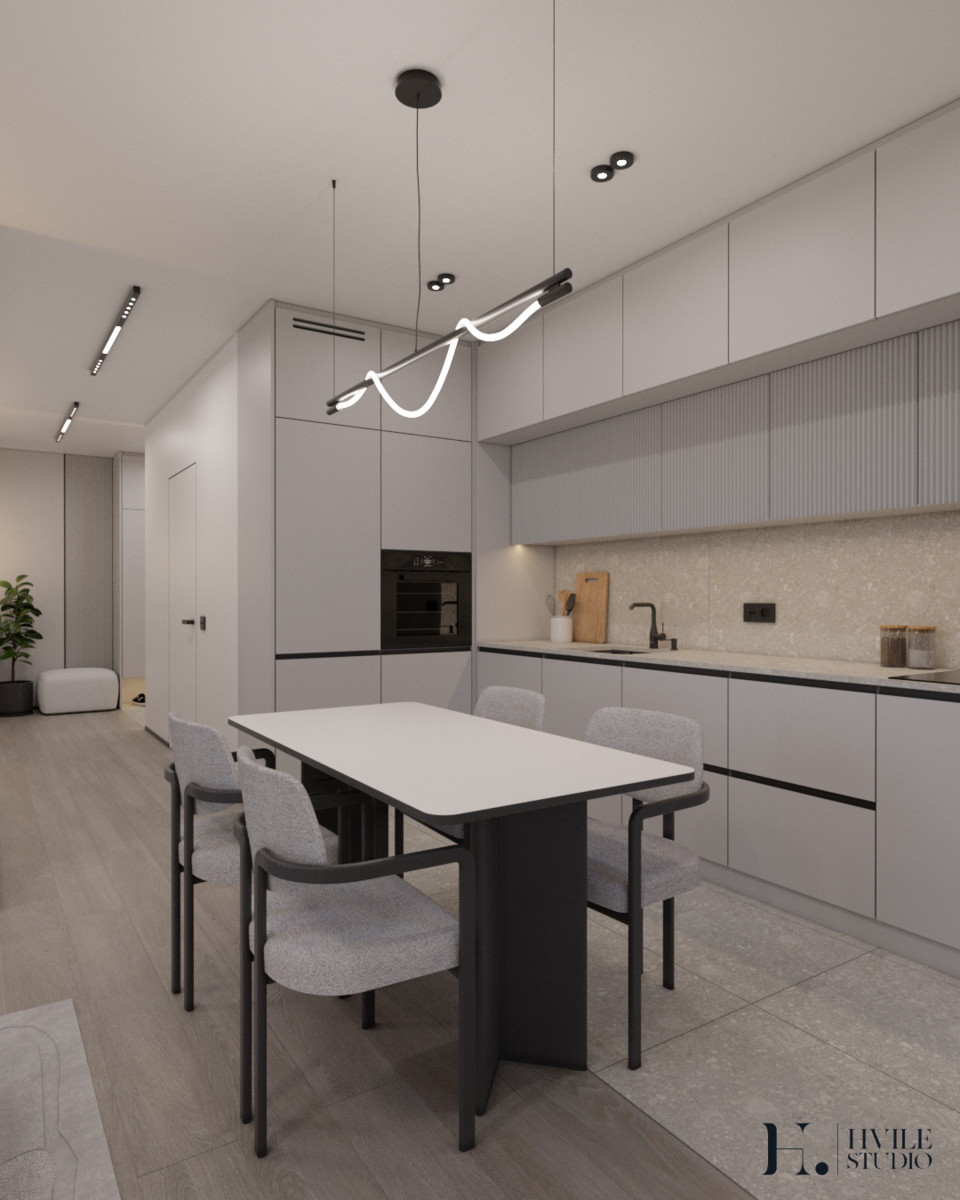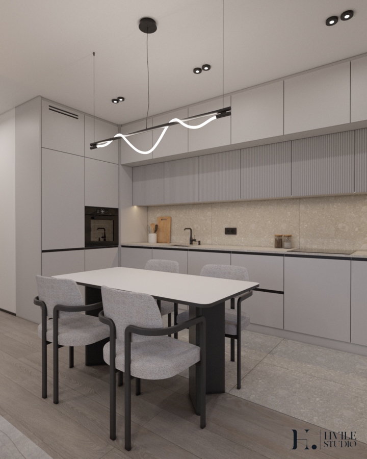 W eleganckiej przestrzeni połączonej kuchni z salonem uwagę przyciąga starannie dobrane oświetlenie, które podkreśla charakter i funkcjonalność wnętrza. Nad stołem zawisły designerskie oprawy w stylu SPRITZER, wprowadzające lekkość i finezję. Ich subtelny kształt doskonale wpisuje się w otoczenie, dodając pomieszczeniu przytulności i wyrafinowania.